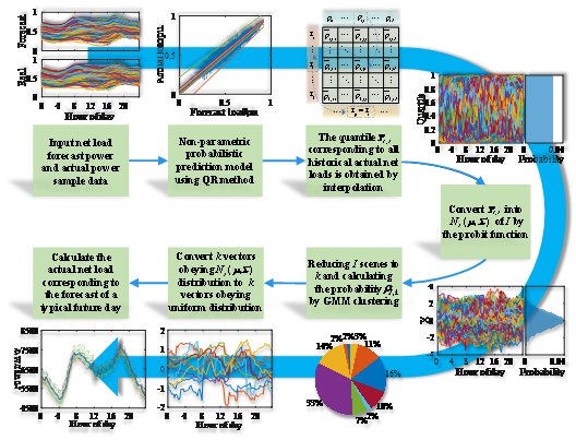 新能源发电的间歇性和波动性、电力市场环境下用户需求的多变性及电网运行的复杂性导致新能源高渗透系统的不确定性问题日益凸显,系统安全稳定运行面临严峻考验。本研究首先针对新能源高渗透电力系统不确定性,以系统净负荷为研究对象,采用分位数回归分析对净负荷数据进行处理,得到不同分位数对应净负荷预测功率与实际功率间的拟合函数;结合Probit函数与高斯混合模型对净负荷场景进行聚类,获得典型不确定场景及其概率;设计典型日净负荷不确定场景集合生成流程(如图1),实现对净负荷不确定性的刻画。其次,针对新能源高占比电力系统调峰、调频等电力电量平衡问题,构建以运行成本最小为目标的含储能系统多场景优化运行模型,获得储能参与系统调峰和调频的运行功率。然后,考虑无储能容量约束下储能运行时充放电电量不平衡问题,建立了储能电量偏离程度指标和运行成本增长率指标,并构建了储能运行功率修正模型,提升储能充放电电量平衡。最后,建立了储能需求功率和容量计算模型,结合不同新能源渗透率典型日的场景概率,分析了新能源渗透率、储能需求与满足系统需求置信度之间的关系。